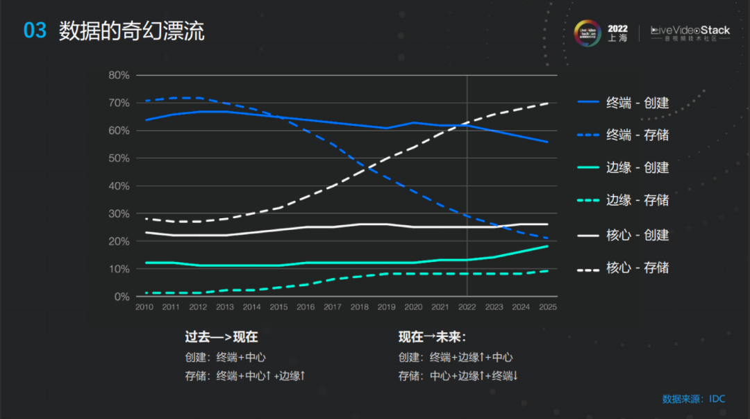 从上图显示,我们数据的创建正在更多的趋向于边缘,同样的数据的存储也会向中心和边缘转变,而终端的占比会下降。但是我们整个数据的处理不断是偏中心,我们的消费又不断在端侧,这样就出现了算力的错位。
