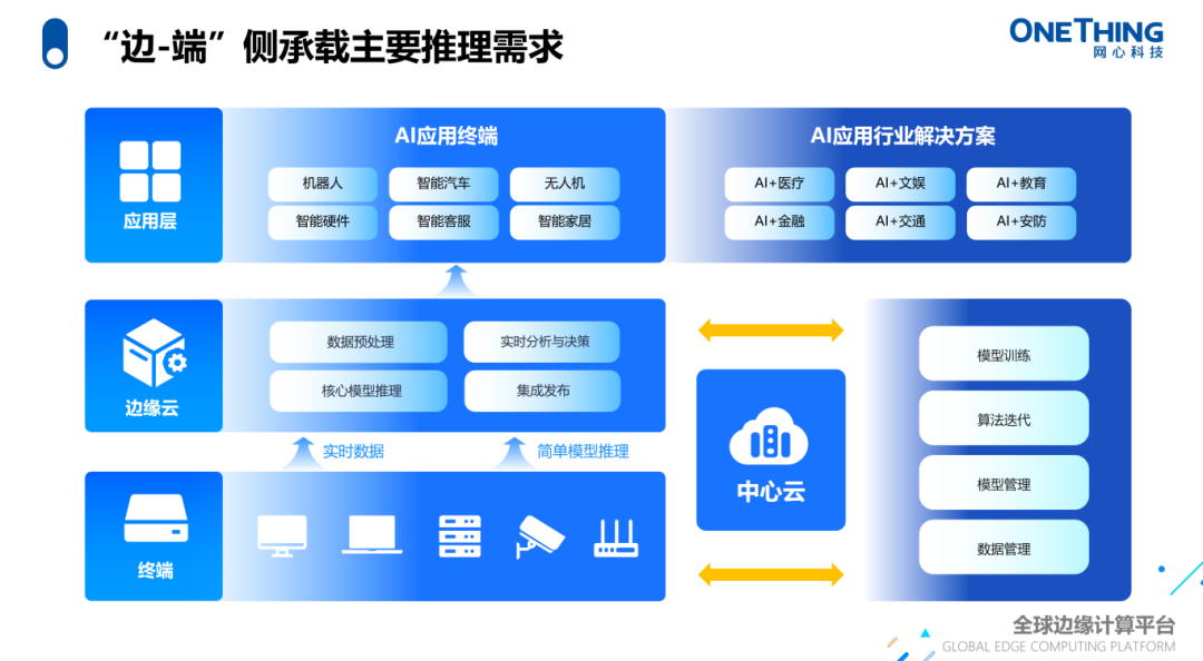 对此,李浩提出“中心云训练+边缘云和终端协同推理”全场景AI训练推理框架,中心云具有强大的计算和存储能力,可承担大数据处理、大模型训练;而基于成本、时延等方面的优势,边缘侧可高效的分发核心模型、承载中大模型的推理、以及承载基于域内隐私数据的模型精调。未来的终端也都会加载小模型,实现大部分日常场景的实时推理。类比人类的大脑,终端侧做快思考,边缘侧做慢思考,云端会做沉淀形成长期记忆。顺利获得云边端协同的方式,更高效完成训推需求。