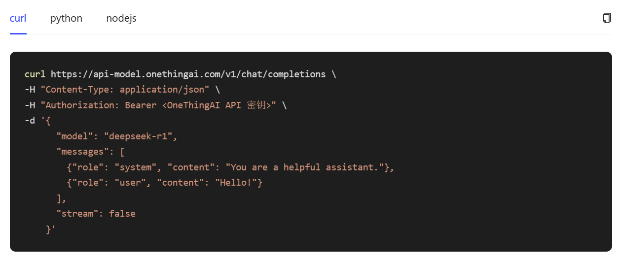 步骤三:给予curl、Python、Node.js三种技术方案,实现与模型API(如 DeepSeek - R1 模型接口)的交互,满足多样化开发场景及开发者使用习惯。