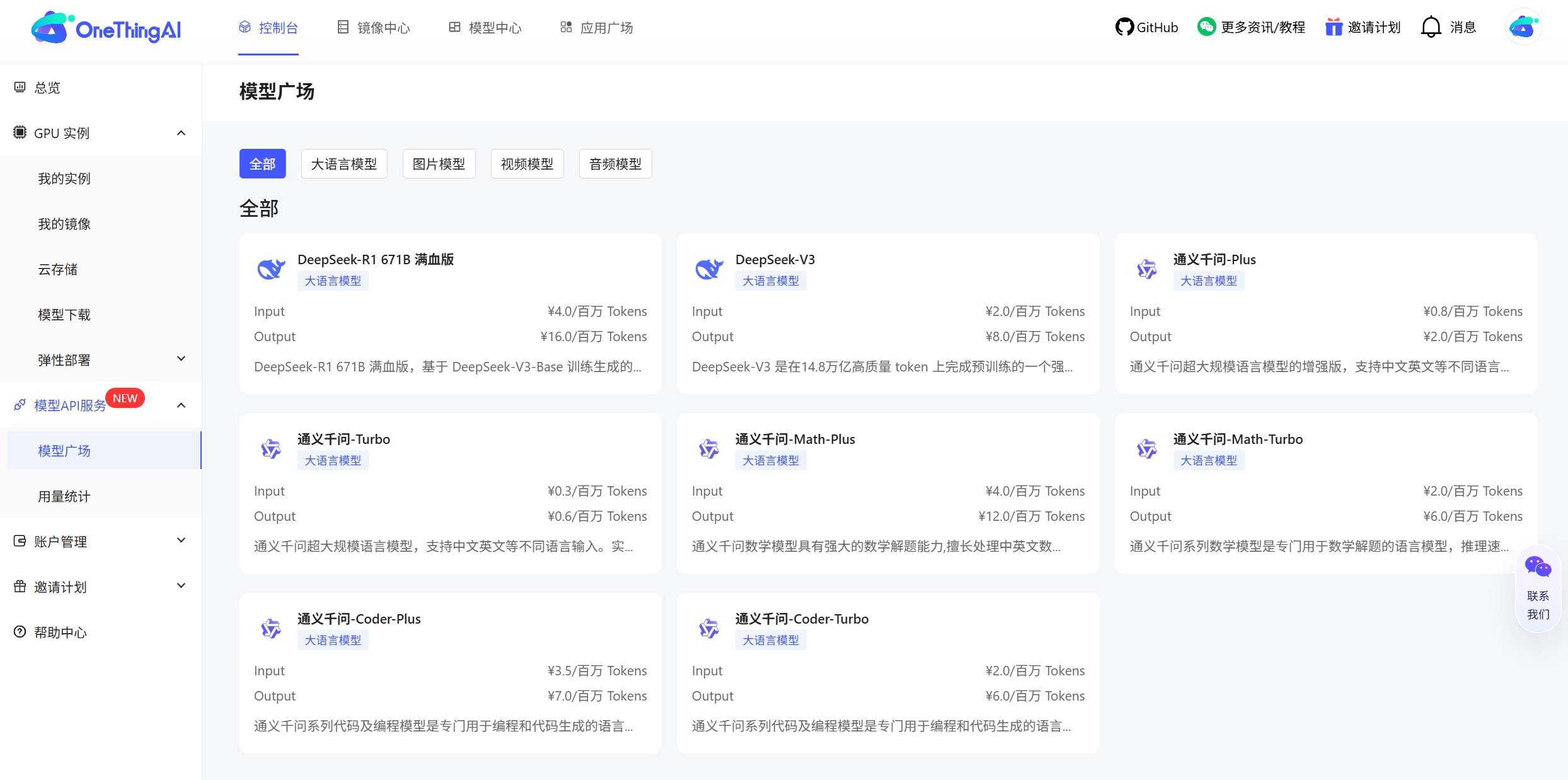 开发者可前往OneThingAI控制台-模型广场,快速接入DeepSeek-R1 671B满血版、DeepSeek V3、通义千问-Plus、通义千问-Turbo等精选主流模型接口。
