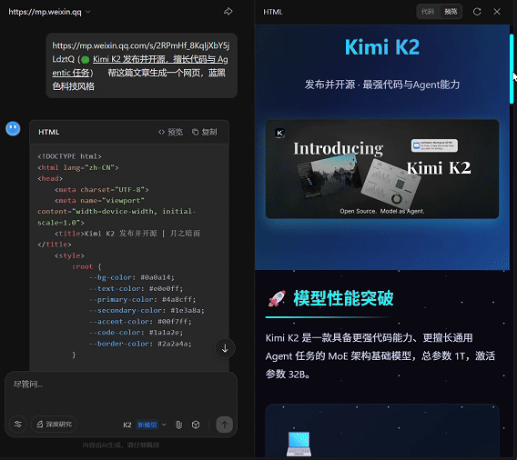 prompt:请把Kimi发布的K2模型介绍文章生成一个网页