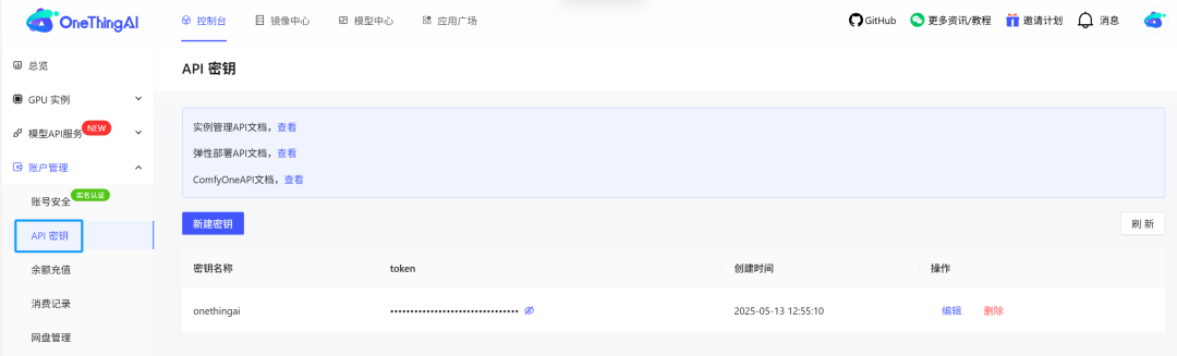 步骤二:获取开发者密钥。登录OneThingAI平台,进入账户管理,选择「API密钥」自助创建唯一标识密钥。