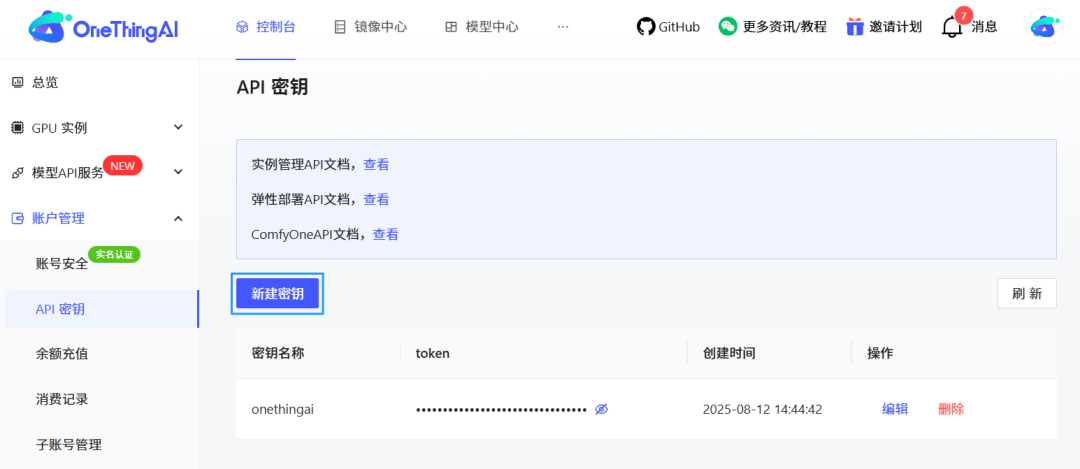 2)前往控制台 - 账户管理 - API 密钥管理页面,点击新建密钥并复制