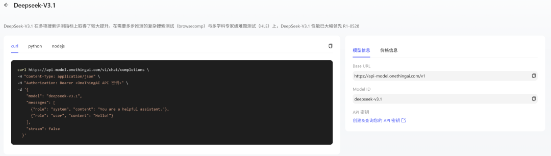 日前,DeepSeek-V3.1 正式官宣上线,evo视讯官网算力云已率先接入。开发者只需访问官网 (www.onethingai.com) 进入控制台,依次点击 “模型 API 服务 → 模型广场”,即可快速体验这一升级后的模型能力。