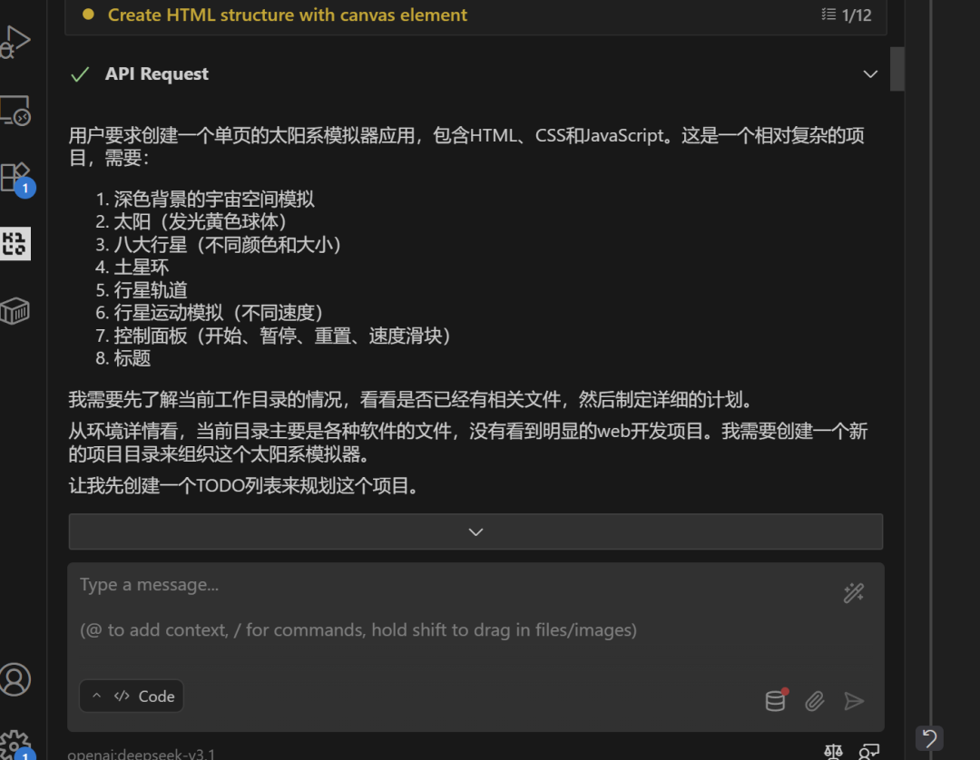 3)完成配置,就让 V3.1 为我们生成一份前端网页动态效果代码吧: