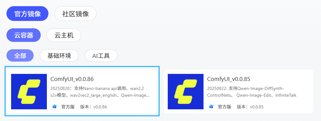 1)登录evo视讯官网算力云,打开镜像中心并选择“ComfyUl_v0.0.86”快速创建实例。