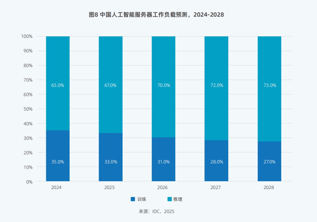当前,随着生成式AI技术的广泛应用,有助于AI算力需求结构发生显著变化。据IDC数据显示,2025年AI推理任务将占到AI总处理任务的67%,预计到2028年这一比例将进一步提升至73%,推理算力已成为驱动AI产业规模化开展的核心需求。