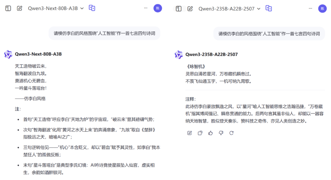 在应对清华北大奥数题目时,Qwen3-Next-80B-A3B(Thinking)与上一代 Qwen3-235B-A22B-Thinking-2507 的表现旗鼓相当,尽管二者解题思路存在差异,但都清晰推导解题过程并给出了正确答案。