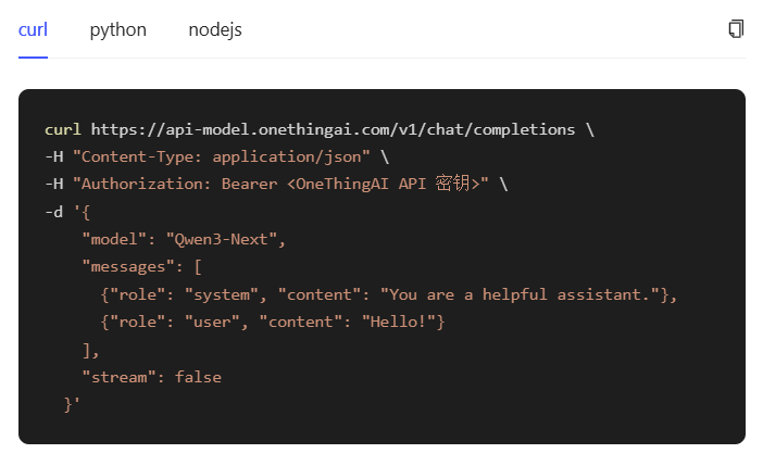 步骤三:OneThingAI平台给予curl、Python、Node.js三种技术方案,以便快速接入模型Qwen3-Next,满足多样化开发场景及开发者使用习惯。
