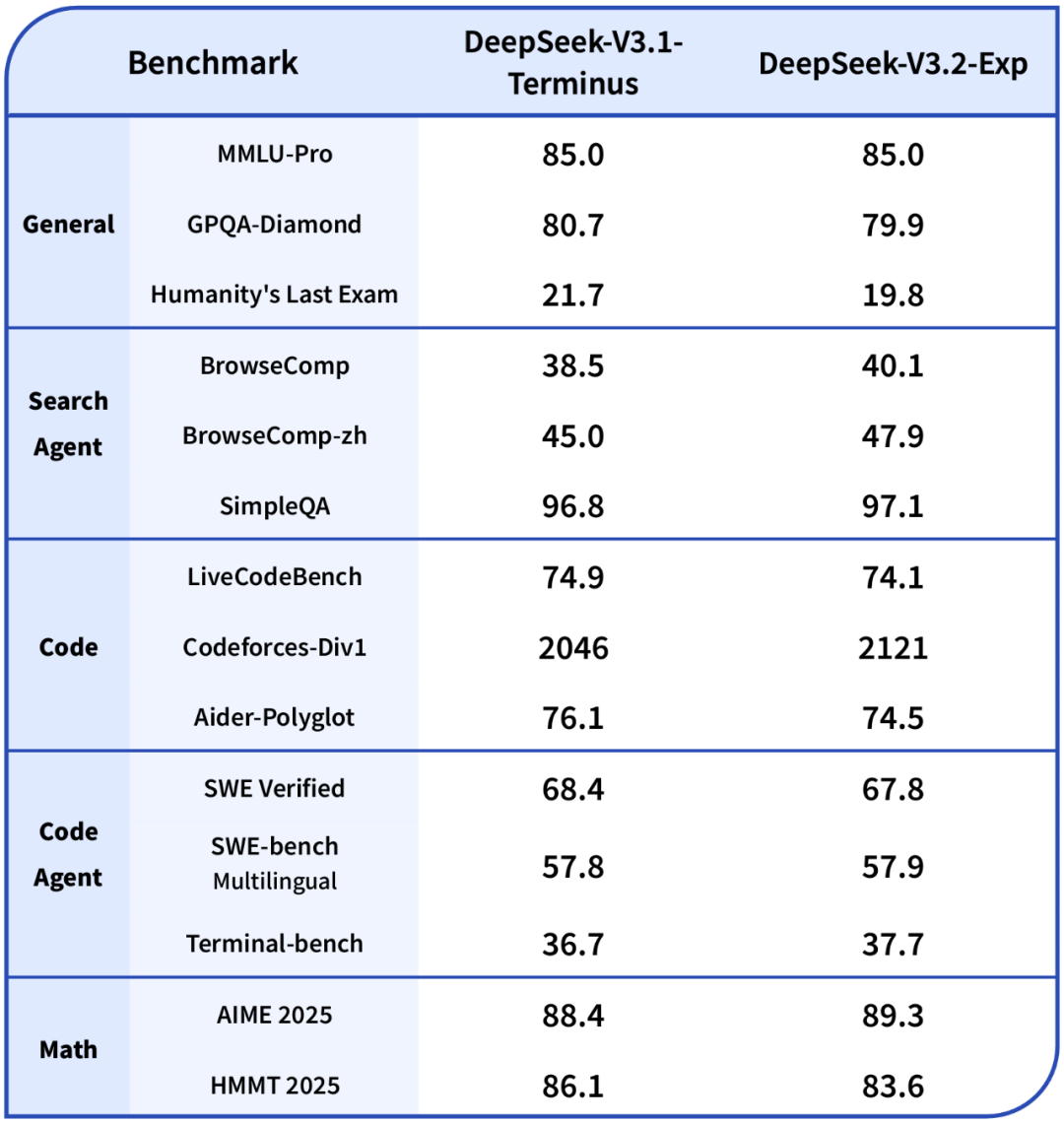 在基准测试中,V3.2-Exp与V3.1-Terminus的表现基本持平。