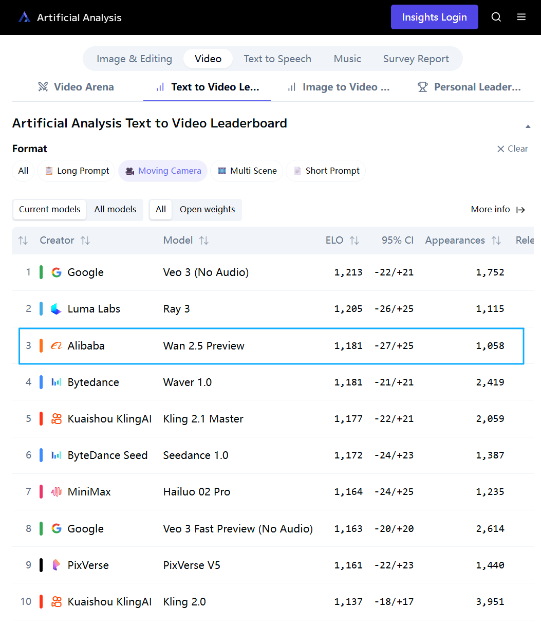 在 Artificial Analysis 文生视频榜单(Moving Camera)中,Wan2.5 理解复杂运镜变化指令的表现已跻身国际顶尖模型前列。