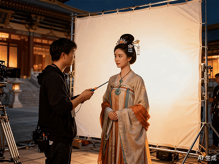 提示词:画面镜头轻微晃动,模仿手机拍摄时的不稳定感。工作人员一边调整女演员的服装和配饰,一边和女演员交谈。女演员说:“我马上好了。”女演员撩了下头发,她注意到被拍摄,看着镜头挥了挥手,说:“大家好啊。”